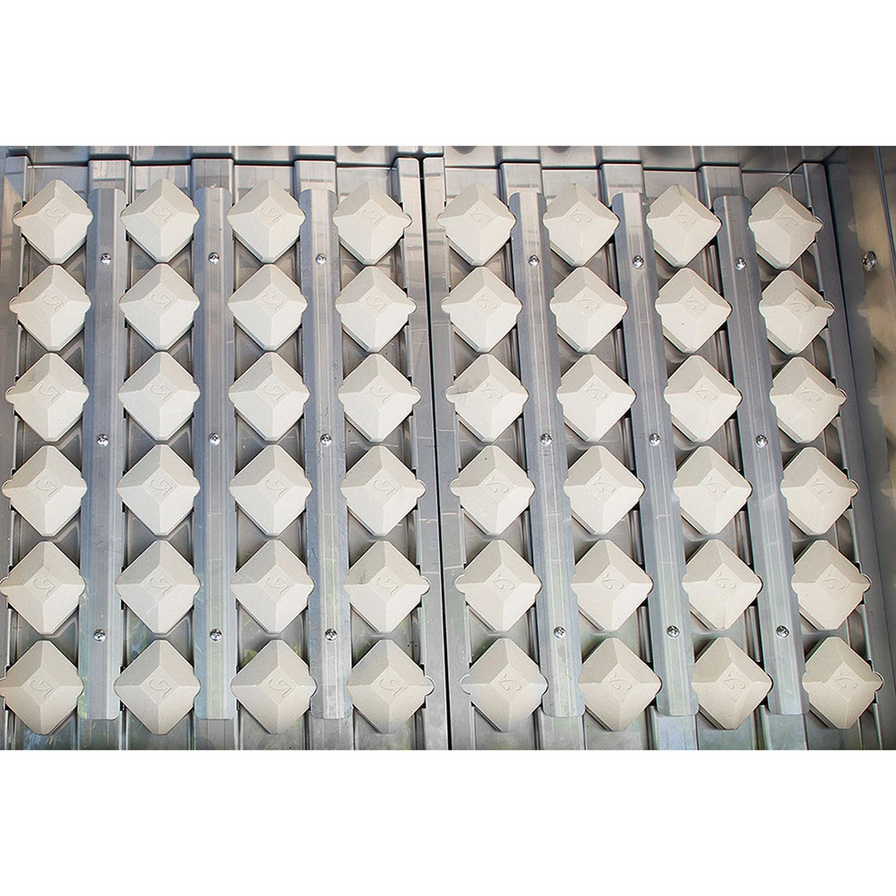 - To eliminate hot and cold spots making the effective grilling area 100% of the grilling surface. A special pyramid shape with a flat top and heat-holding cavity on underside evenly delivers intense heat to the cooking surface. Radiant tray locks briquettes in place. Turn tray over and fire burners on high with lid closed to self clean.